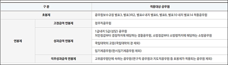 공무원의 봉급은 호봉제와 연봉제로 나누어지며, 연봉제는 고정급적연봉제, 성과급적연봉제, 직무성과급연봉제로 세분됩니다. 적용 대상 공무원은 아래 표를 참고하세요.